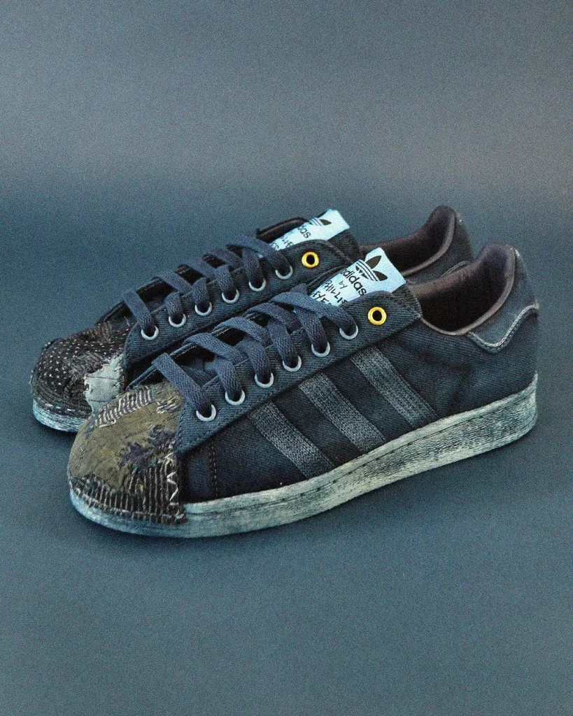 The most striking change is the deconstructed denim shell toe, rebuilt with patchwork in the style of Japanese boro and sashiko textile techniques. The indigo denim continues across the upper and midsole, giving the sneaker a rugged, workwear feel that contrasts beautifully with the Superstar’s clean shape.