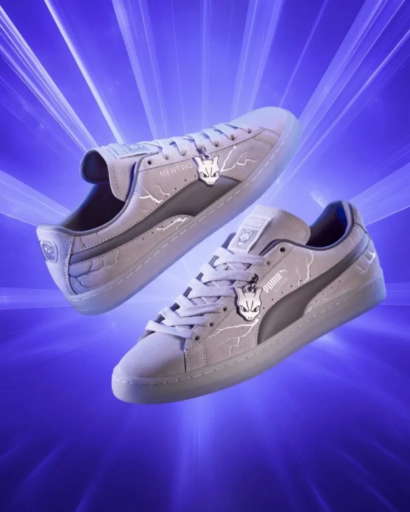 The iconic Suede silhouette becomes a vessel for the psychic-type legend’s aura. Cloaked in varying shades of purple, from dusty lavender uppers to darker violet accents along the Formstrip, the design mirrors Mewtwo’s mysterious energy. Lightning-bolt motifs crackle along the sides, while translucent soles subtly reveal “ミュウツー”, the Pokémon’s Japanese name, underneath. Metallic hangtags and embossed heel marks lend a refined, limited-edition finish.