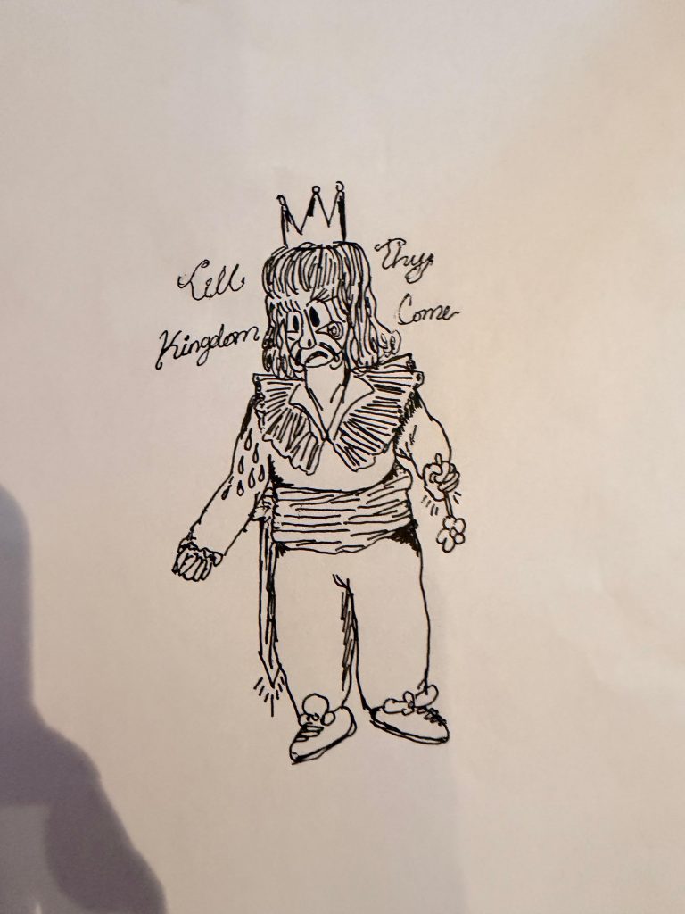 Layered behind it, “Till Thy Kingdom Come” adds a sense of permanence and scale. It reshapes the piece from something graphic into a statement piece. This style, mixing seriousness and absurdity has become central to Slawn’s work.