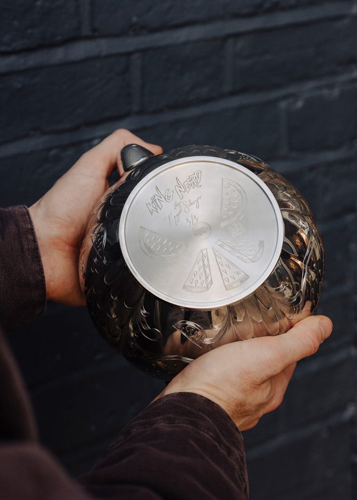 The core of this collaboration with Royal Selangor isn’t getting a limited release, rather it stays a 1-of-1. He engraved a intricate pattern of foliage meeting sliced melon, repeated around the full circumference of the pot. The handles remain untouched, to keep the original form.