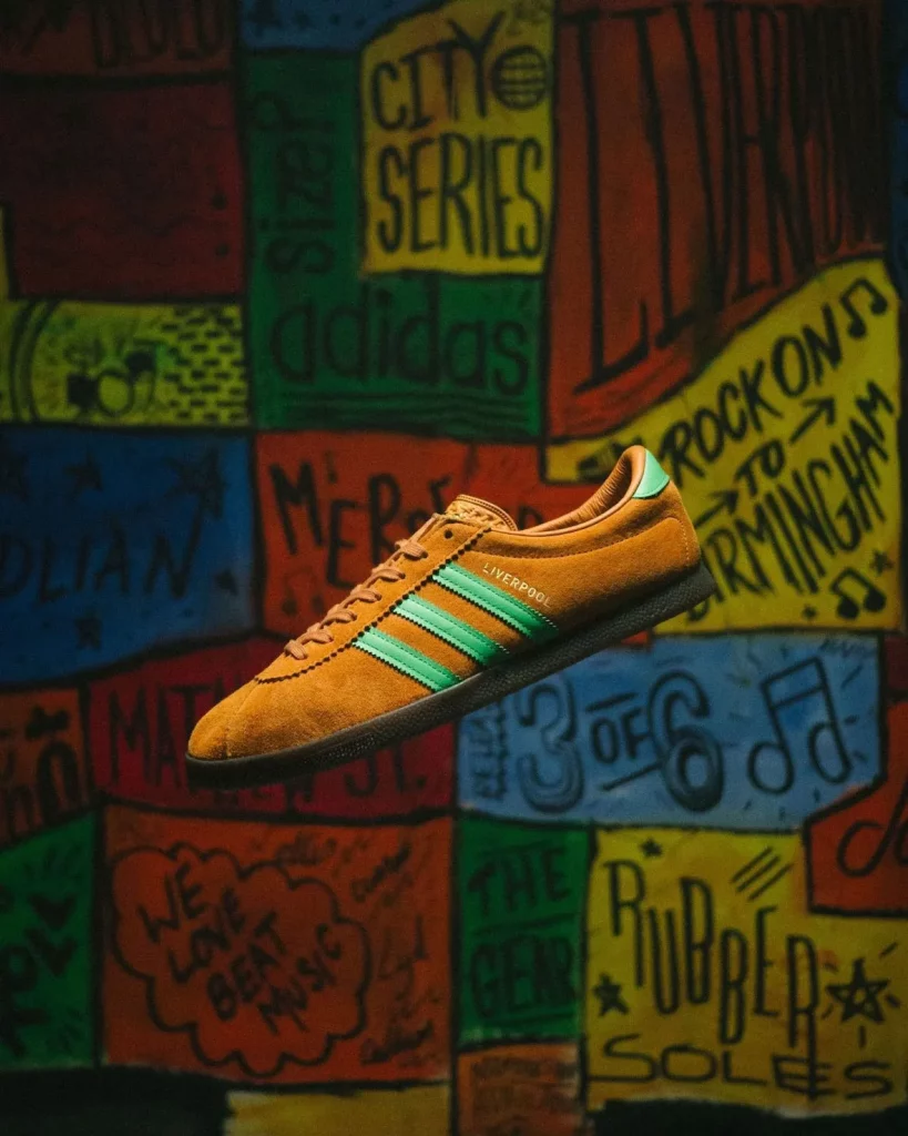 The sneaker’s design is influenced by the ornate restroom tiles of Liverpool’s Philharmonic Dining Rooms and the city’s coat of arms. These elements are reflected in the shoe’s blazing orange suede upper and vibrant green stripes, creating a bold and eye-catching style.