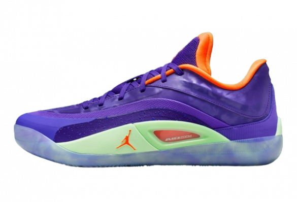 The Jordan Zion 4 “Rare Form” mixes purplish uppers, orange accents, green Air Zoom units and a translucent outsole with...