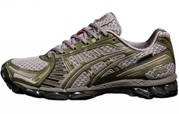 The pair blends grey mesh with reflective olive patent leather overlays, creating a sleek contrast between performance and sophistication. Subtle splashes of red on the tongue and outsole break up the neutral palette, while the vibrant green insoles and reversed “UP THERE” heel branding add distinct collaborative flair. The shoe’s stability-focused midsole is retained, ensuring the GEL cushioning remains as smooth and reliable as ever.
