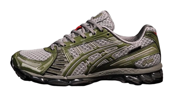 The pair blends grey mesh with reflective olive patent leather overlays, creating a sleek contrast between performance and sophistication. Subtle splashes of red on the tongue and outsole break up the neutral palette, while the vibrant green insoles and reversed “UP THERE” heel branding add distinct collaborative flair. The shoe’s stability-focused midsole is retained, ensuring the GEL cushioning remains as smooth and reliable as ever.