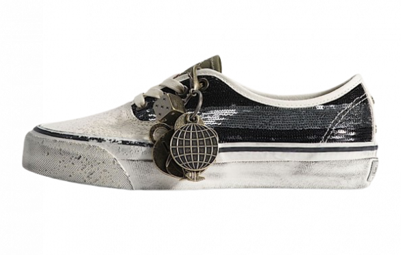 Black canvas forms the base, allowing the striped sequin panels to stand out more clearly. The contrast feels intentional, drawing the eye without overwhelming the shoe.