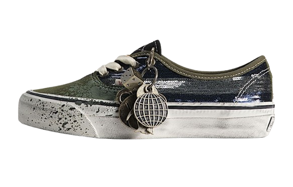 Striped sequin panels sit against washed olive canvas, creating contrast between shine and softness. Paint splatter detailing breaks up the surface and keeps the shoe grounded in skate culture, while pre-worn sidewalls remove any sense of preciousness. Metal bolt hardware on the heel quietly mirrors luxury bag construction without turning the shoe into a novelty. Paracord laces and small charm-style keychains add personality and movement to the pair.