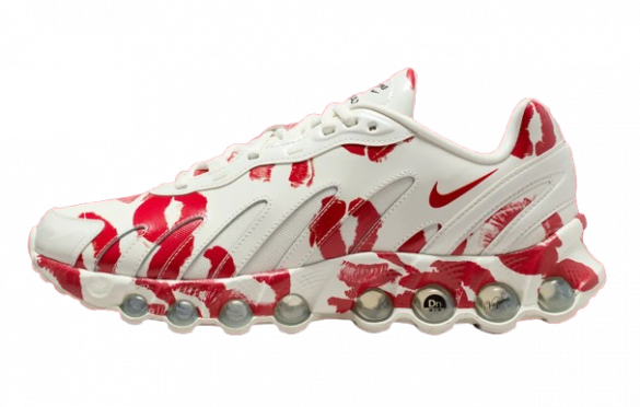 The shoe lands in a glossy white upper plastered with all-over lipstick prints, giving it a rebellious, almost mischievous energy. A burning red Swoosh cuts across the chaos, while a Vaquera badge hits the tongue for a couture-leaning finish. Underfoot, the DN8’s distinct eight-chamber Air system stays untouched, grounding the wild styling in proper performance tech.