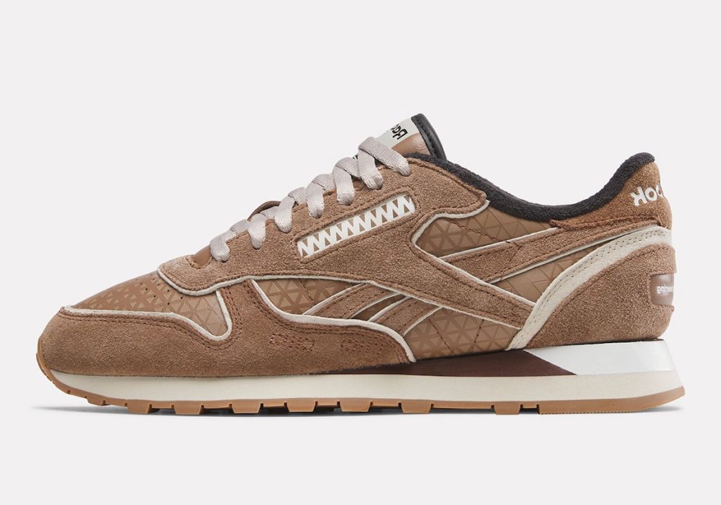 Reebok and White Mountaineering continue their creative partnership with the release of the Classic Leather “Brown” in Spring 2025. This colorway brings an earthy, rugged edge to the iconic silhouette, combining premium materials with intricate design elements. The sneaker features a warm brown suede upper, accented with laser-etched triangular patterns on the toe box and quarter panels. White Mountaineering’s “WM” initials are subtly incorporated into the side panel design, while the tonal brown laces and off-white midsole create a balanced, vintage-inspired aesthetic. Subtle branding cutouts on the heel add a modern yet understated touch.
